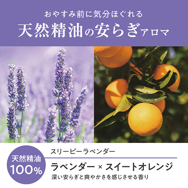 お風呂上がりのおやすみ準備に、天然精油100%の安らぎアロマでうるおいケア。