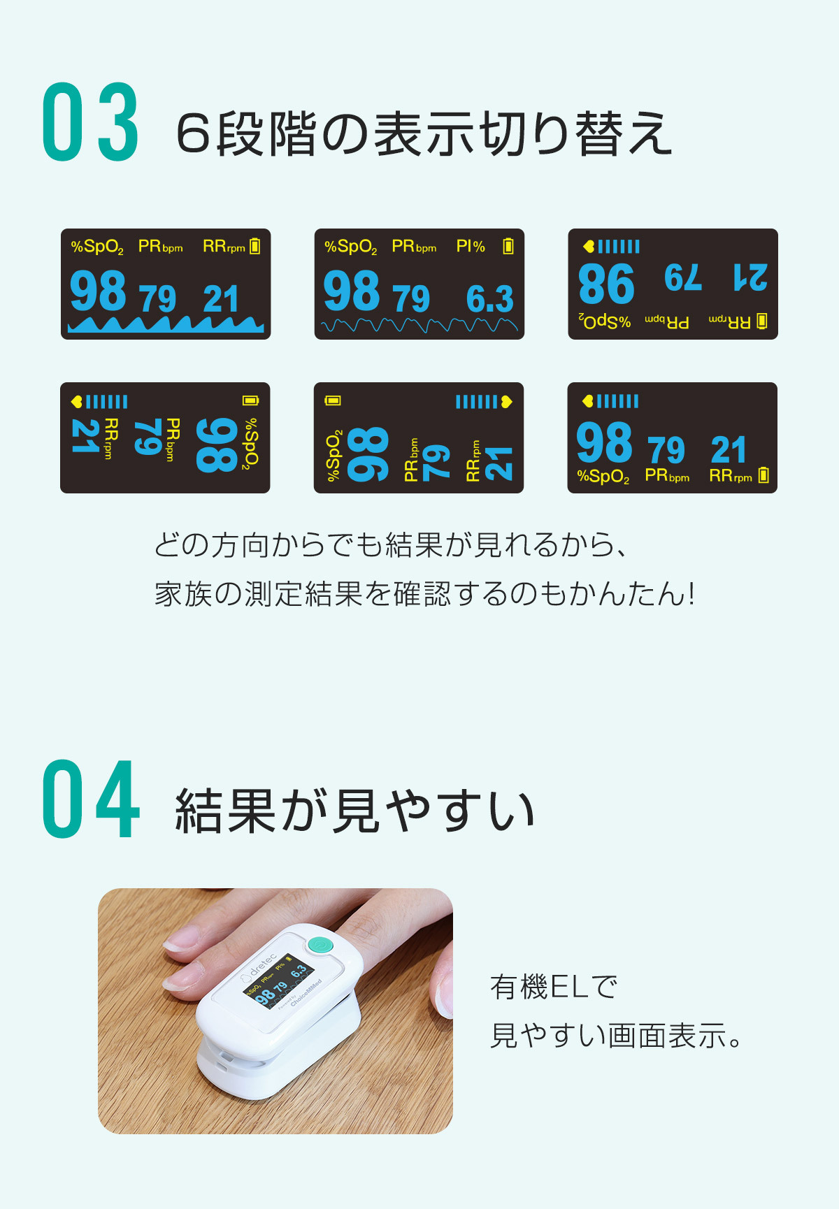 ・血中酸素飽和度(SpO2)/脈拍数/PI値を測定できる