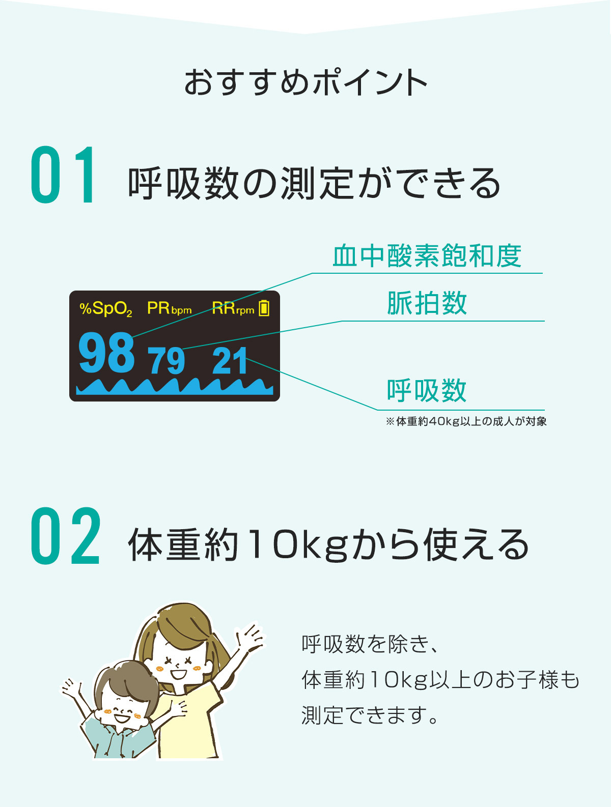 ・測定可能な体重の目安:約10kg以上(呼吸数を除く)