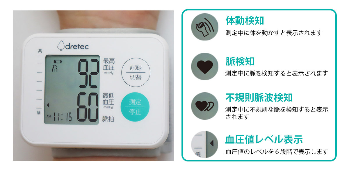 ・脈検知機能、不規則脈波検知機能、体動検知機能付