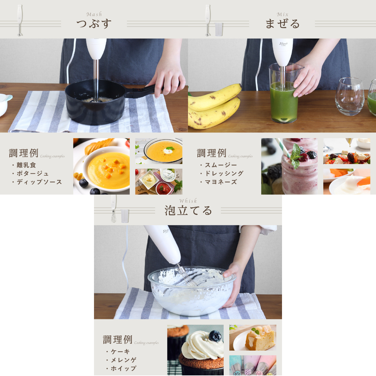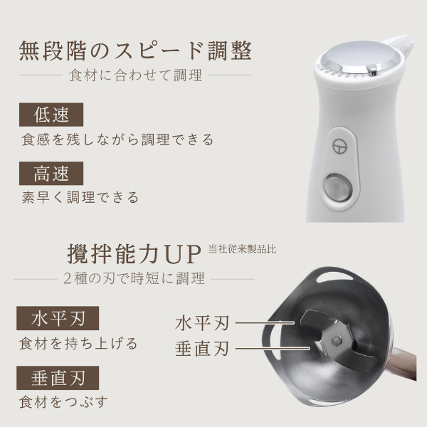 ・「つぶす」「まぜる」「泡立てる」の1台3役で調理をサポート