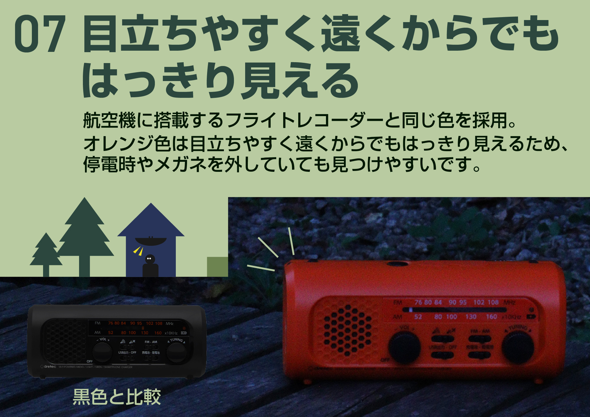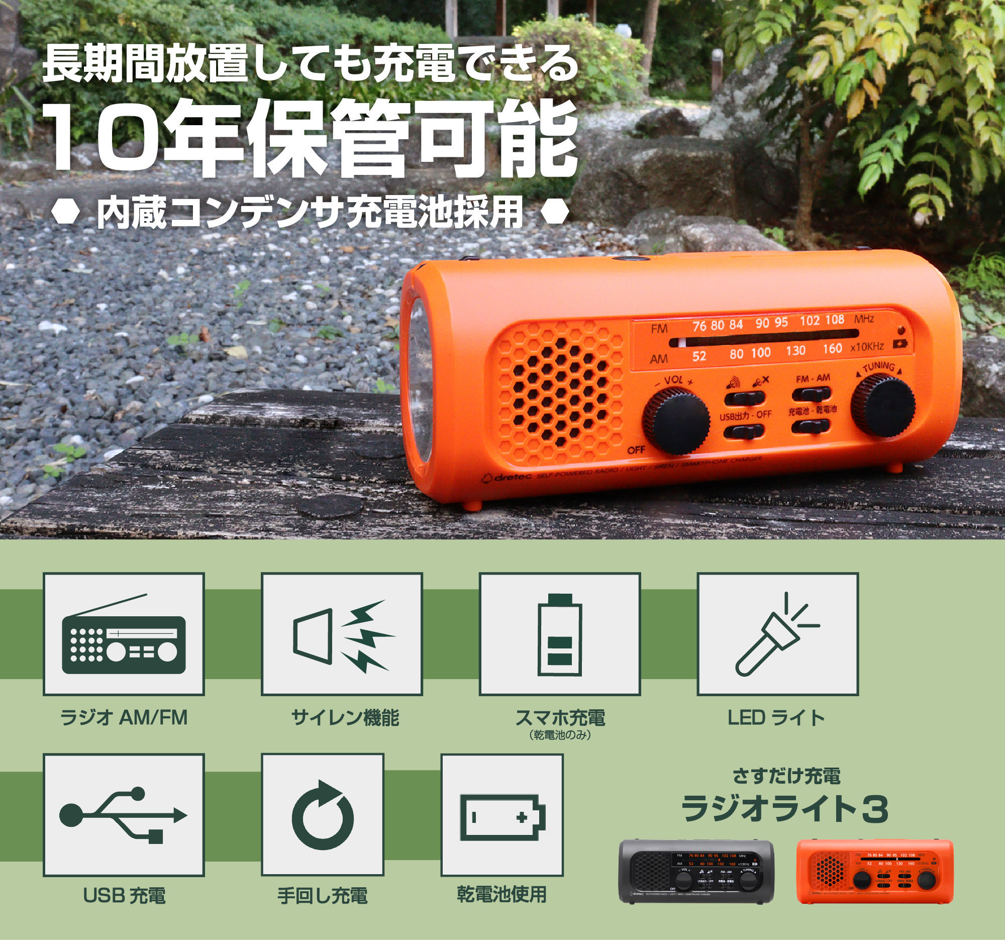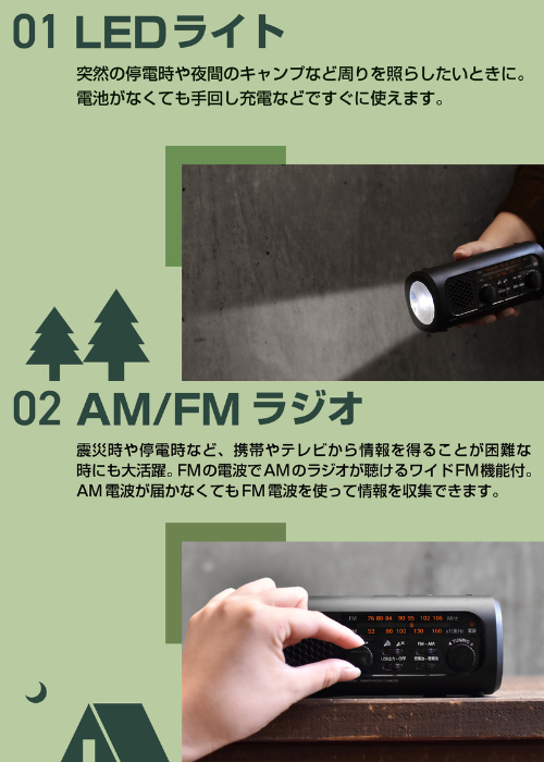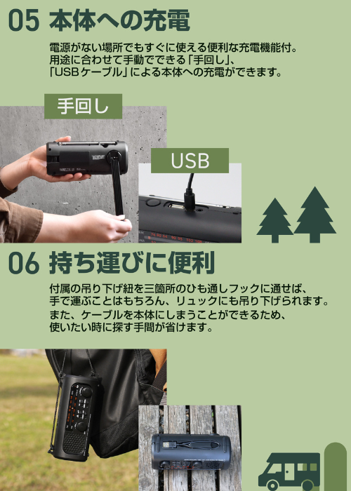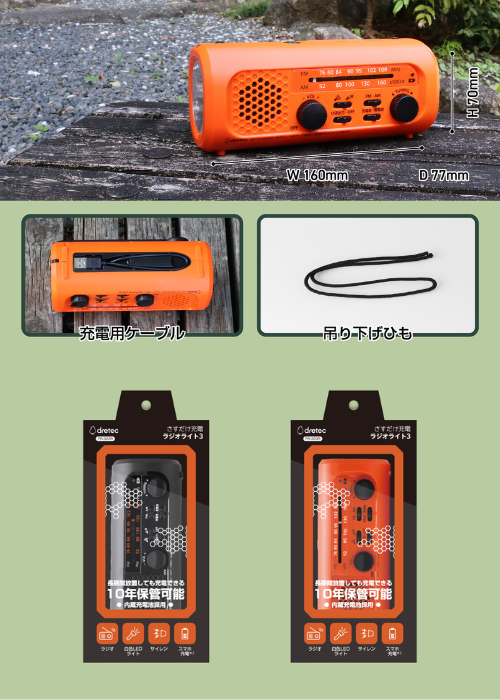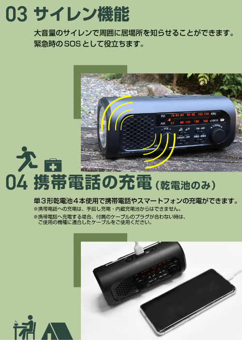 ・内蔵充電池は手回し発電で充電可能