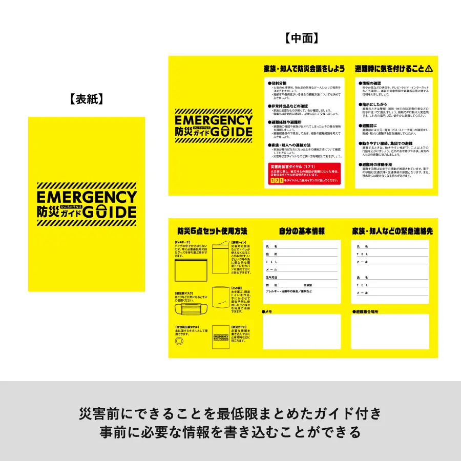 また、防災ガイドも付属しているため事前に必要な情報を書き込むことができます。