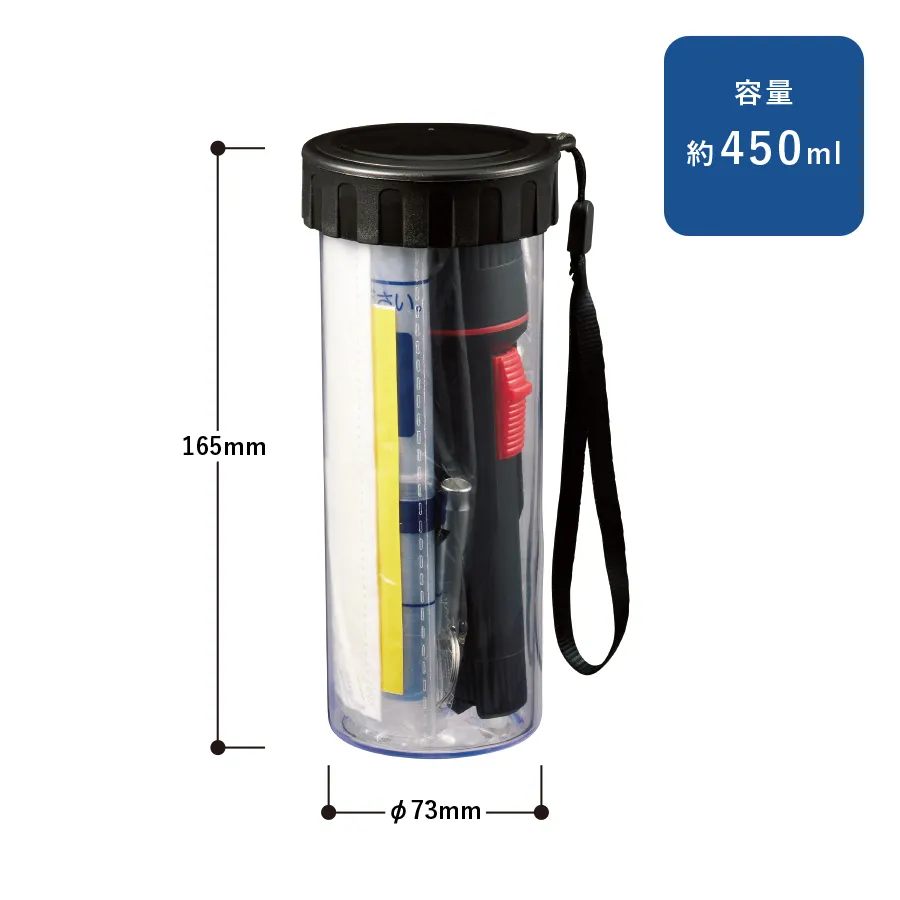 災害時に欠かせない防災グッズ7点をボトルにひとまとめに揃えたセットです。