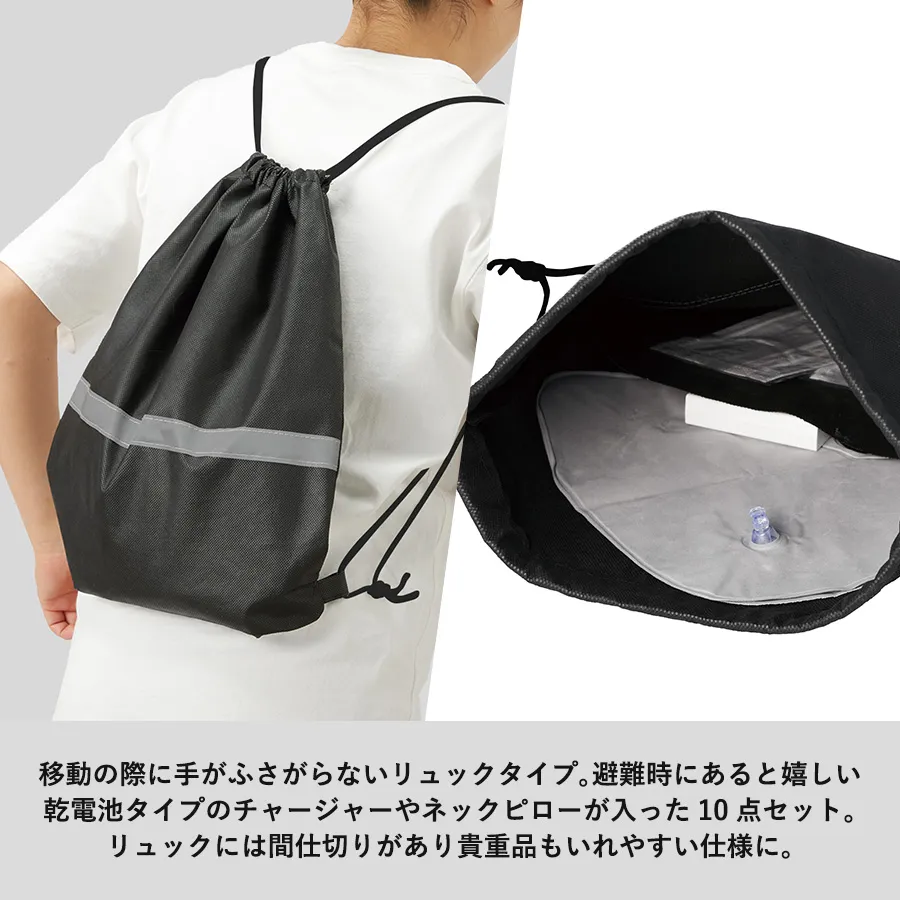 災害時に外に簡単に持ち出せる、リュックタイプの防災グッズ10点セットです。