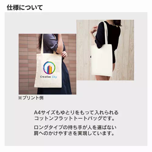 A4サイズもゆとりをもって入れられるコットンフラットトートバッグです。