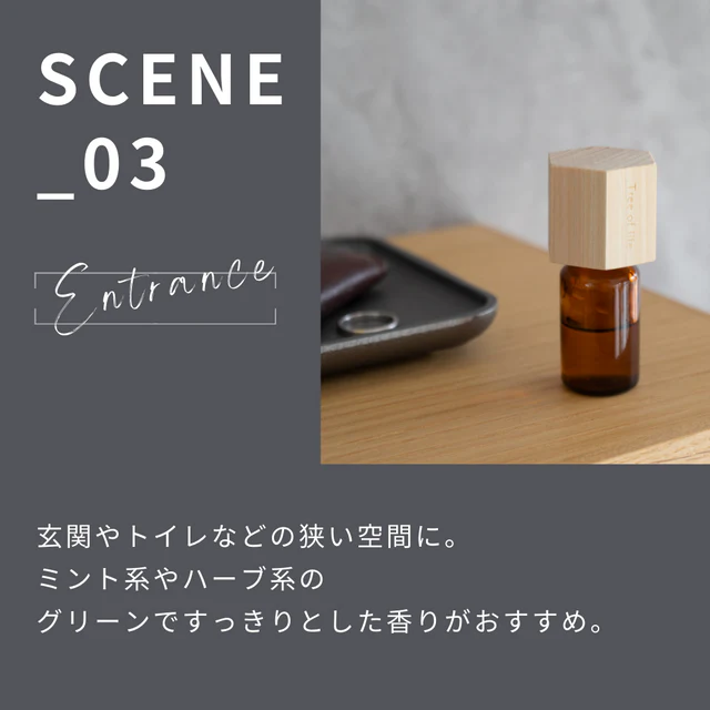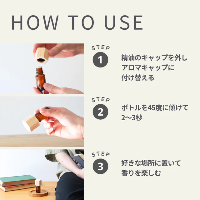 10mlの精油で、約30⽇分(3秒傾ける×2回/1⽇使用時)の使用目安です。
